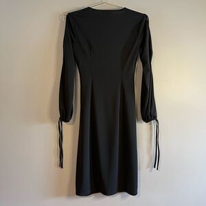 Stunning little black long sleeve dress from Express, in a size 1/2. Featuring low cut v-surplice neckline with side ruching at the one side of the waist, long split sleeves with ties at the cuffs, form fitting, and side split hem; excellent condition ✨