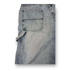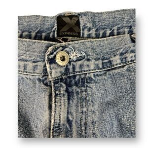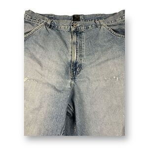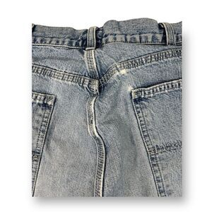 Preowned, good used condition. Distressing throughout from wear. Holes above and below back pockets.