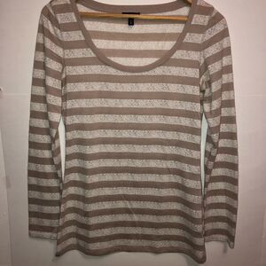 Express long sleeved scoop neck t- shirt. Tan and white stripes with silver accents. White stripes slightly see through.