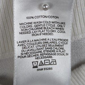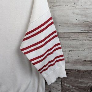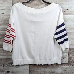 Pre-Owned Condition! 100% Cotton. Comfy White Sweater with Red-Blue Striped Sleeves, Ribbed Neckline & Sleeve Hem.