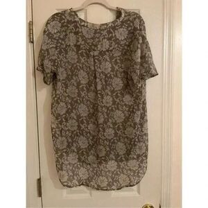 Keywords: Express, women's blouse, gray floral, collared, short sleeve, polyester, button closure, machine washable, casual wear, office wear, pre-owned, like new.