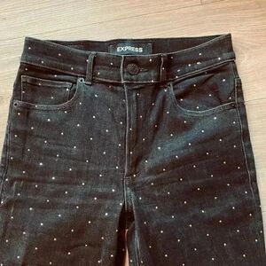 Amazing like new. Express black, high rise ankle legging jeans. Covered in rhinestones. Have super stretch. Glitter wherever you go.