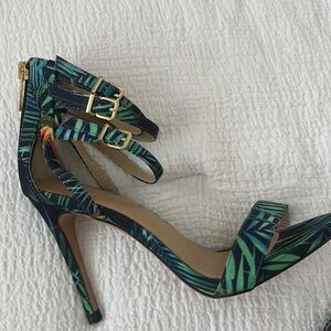 Stunning! Brand new, never worn. Gold buckles around ankle and back zipper. Navy blue, teal colors with hints of orange, yellow, and white. I do not have box