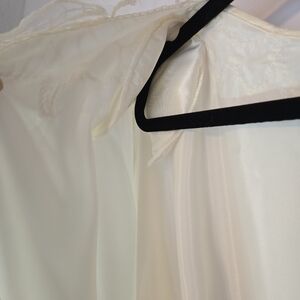 The ivory polyester satin fabric ensures a comfortable and lightweight experience, while the 3/4 sleeves add a layer of warmth suitable for any season. The pullover closure allows for easy wear, and the belted design offers a flattering fit. This peignoir set, echoing the classic themes of wedding and vintage, is machine washable for convenient care. Whether for a luxurious night in or a timeless addition to a bridal wardrobe, this set is a beautiful blend of fashion and comfort.