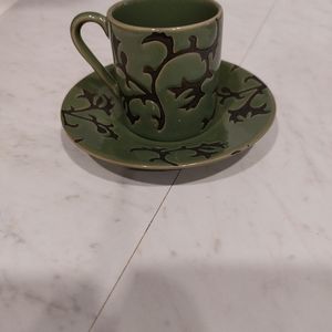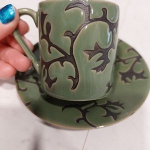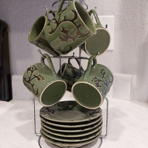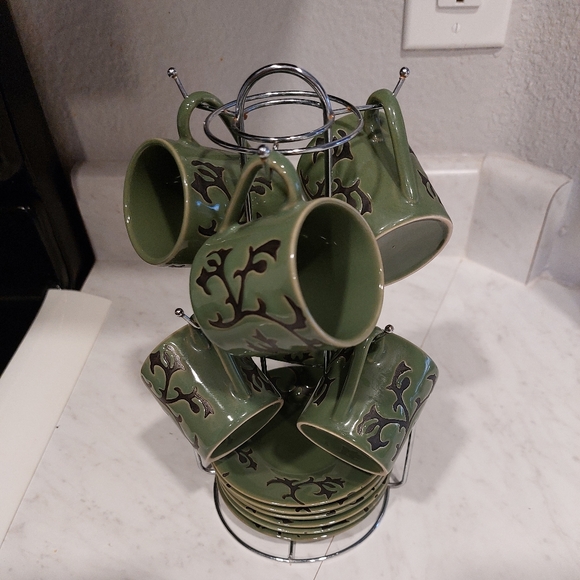olive green and black espresso set. it comes with 6 cups and 6 plates with stainless steel stand .