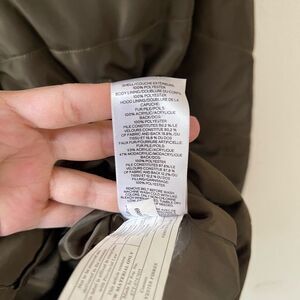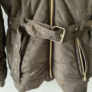 Has a longer length. In excellent condition. Size small. Oblige green color with gold accents. The faux fur hood is removable