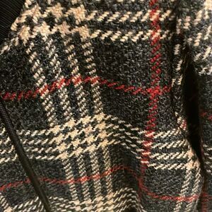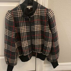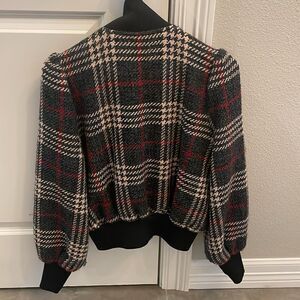 Excellent condition fabric is a fuzzy blend with a tweed design a bomber fit with puffed sleeves