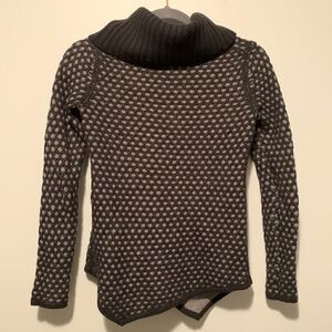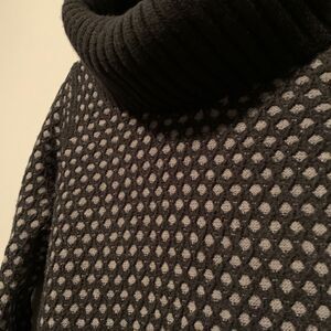Black & gray turtleneck sweater. Black woven pattern creates polka dots to appear from the gray base sweater layer. Warm and fitted. The bottom of the sweater has asymmetrical angles, that compliment the bulky turtleneck well.