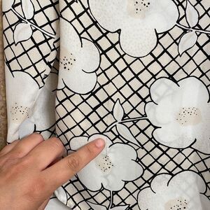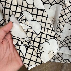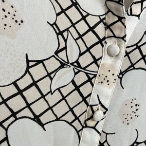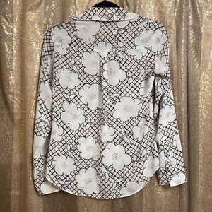 Absolutely beautiful pattern on this one! Colors are white, black and a soft ivory color. One button on the top of the blouse is missing but honestly no one is even gonna notice, one small pull on the back of the shirt too. The pattern is so busy and pretty no one is honestly gonna notice that either. Other than those this shirt is in perfect wearable condition. No signs of even being worn. Smoke and pet free home. Size XS slim. Sleeves can be rolled up and buttoned into 3/4 sleeves.