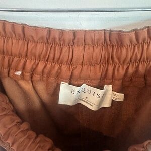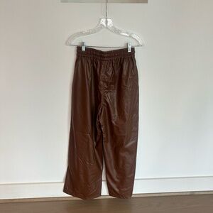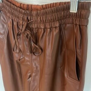 These brown faux leather pants have a relaxed, wide-leg fit with an easy elastic waistband and drawstring. They feature side pockets and a soft lining for extra comfort. An effortless way to dress up any outfit while staying comfortable.