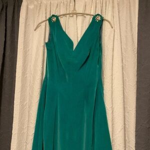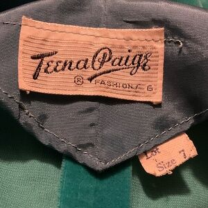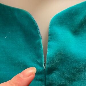 Crazily enough, I earned this fab dress by Teena Paige as an award at work. I have protected it and cared for it like a dear friend. This scrumptious, soft aqua velvet, tank, A-line flare dress is a is a gem of 1950’s elegant party fashion and features eye-catching metal and glass crystal flower accents sewn onto the shoulders (the straps look like they should unbutton but they don’t, they’re sewn), a unique scoop v cut on the bust, a flattering fitted waist with a flare skirt that bells out beautifully, a left side zipper, and a silky feel strip of chest liner fabric in a soft cornflower blue. The inside of the velvet fabric feels to be a soft cotton, but the outer velvet is so high quality and yummy. This treasure is in nearly immaculate condition for being over 70 years old!! You won’t be seeing fast fashion hold up like this has. There are a few of the little crystals missing from the shoulder accents (pictured) Theres’s the very slightest fraying of the chest- V thread (pictured) and there are a few spots of the velvet that are ever so slightly faded by the sun. It is a breathtaking piece of fashion. The tag says sz-7 I’d call it XS. I include this disclaimer on pieces that really have a piece of my heart: I’m not budging much on this price. This dress is rare and gorgeous- you know it, I know it. So please understand that it’s very hard for me to part ways with and so I’ll not be taking any low offers.