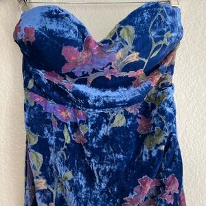 Lulus Exquisite Blue Floral Burnout Velvet Strapless Maxi Dress! Luxe velvet, with a burnout moody floral print throughout, shapes this dress that has a strapless sweetheart neckline (with hidden no-slip strips) and a fitted bodice with padded cups. Gathering at the waist tops an overlapping tulip maxi skirt. Hidden back zipper/clasp.