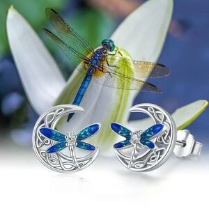 Exquisite Blue Winged Dragonfly & Moon Stud Earrings
