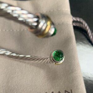 An exquisite open bracelet from David Yurman, showcasing vibrant green gemstones against the backdrop of polished sterling silver and golden accents. A truly captivating piece.