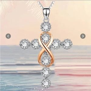 Exquisite cross in silver with the gold infinity symbol in the center. Adorned with white sapphires with beads surrounding each sapphire. The cross is 1-1/2” in length and 1” across.