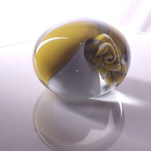 This is a beautiful Mihai Topescue style hand- blown glass paperweight. It weighs 503 grams. There are a few air bubbles inside, but they do not distract from its beauty. There are no major flaws with this piece.