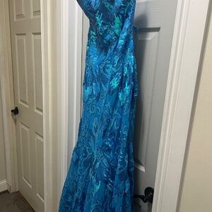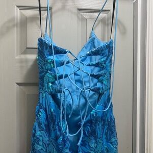 Absolutely exquisite sequined sleeveless prom evening dress! Silhouette is fitted with a slight fishtail style at the bottom that is floor length and bells out. Underneath, the dress has tulle which makes the dress move with you when you walk. The back of the dress is strappy with an open back.