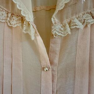 Oh how I wish this fit me! This heavenly peach dress has adorable ivory lace trim, sort of flutter cap sleeves, floral beaded embroidery, little pearl buttons, a flirty pleated skirt, and a most feminine bow tied at the back of the waist. It has everything one could ask for in a flattering vintage dress.