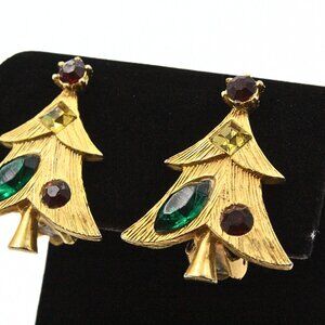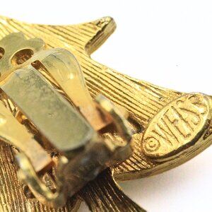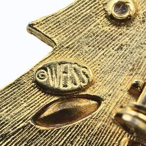 Delight in the festive allure of this exquisite designer jewelry set by Weiss, which includes a stunning brooch and coordinating earrings that embody the spirit of the holiday season. Both pieces feature intricately crafted Christmas tree designs made from textured gold plate, creating a rich backdrop that beautifully enhances the vibrant, multi-colored glass ornaments in red, green, yellow, and blue. Each element sparkles with charm, capturing the joyful essence of Christmas while offering a touch of elegance that is perfect for holiday gatherings. Clearly marked with "WEISS," this set exemplifies the brand's commitment to quality and artistry, ensuring it will be a cherished addition to your jewelry collection. In mint condition, the brooch measures approximately 2" long by 1 1/2" wide, while the earrings are about 1 1/4" long by 7/8" wide, making this set an ideal accessory to elevate your festive attire or a thoughtful gift for someone special.