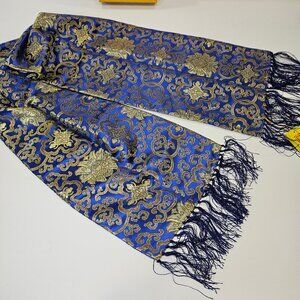 Exquisite Yung Silk Brocade Cobalt Blue And Gold Scarf With Silk Fringe