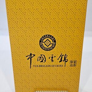Among all ancient fabric silk cloth, known as Jin, represents the industry's top art and crafts. Furthermore, with the rich culture and scientific meaning it carries the, Nanjing Yun brocade is honored by experts as the last milestone in the technological history of Chinese silk fabrics. An inch of the Nanjing Yun Brocade was said to be as valuable as a ounce of gold. What is interesting is that the delicate and soft brocade came out from woven looms as big as 5.6 meters long, 4 meters high, 1.4 meters wide The huge loom needed two operators, one above and one below in the delicate production sequence that was as complicated as a current computer programming language. An exquisite cobalt blue and gold silk brocade scarf in its original box in mint conditions. Scarf and box with tag. Measures 10 5/8 inches wide, 60 inches long. Non smoking pet-free home. UB#3