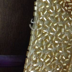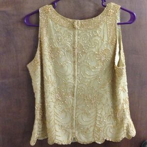 This gold beaded top has never been worn and comes from a smoke free home. It has a couple of areas where beads have come loose just from being in my closet (replacement beads are with tag). Label states it's an XL but looks more like a large or medium.