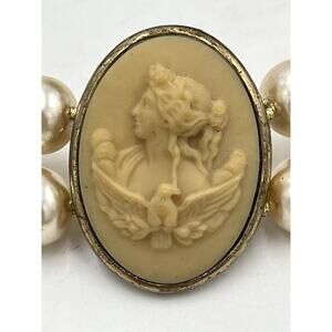 Extasia Signed Vintage Cream Faux Pearl Two Strand Yellow Shell Cameo Necklace