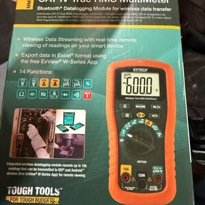 Extech wireless true RMS multimeter with Bluetooth. Features a bright orange and black design. Ideal for remote data viewing and export.