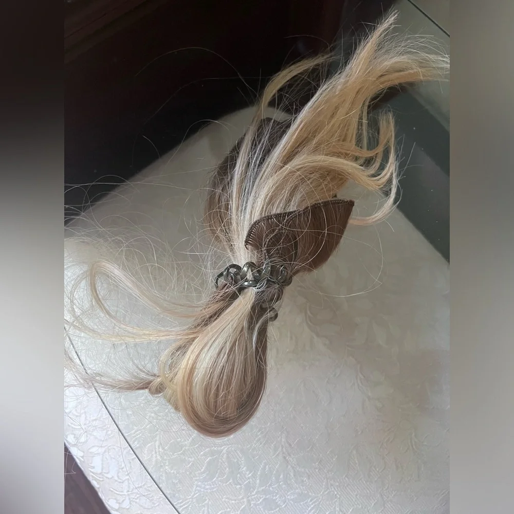 @sacorbit Hi! Yes, the first pic is synthetic and it is probably an ash blonde color. I can’t recall where I purchased but I’m more than happy to take more pics of it if you need it in other lighting
