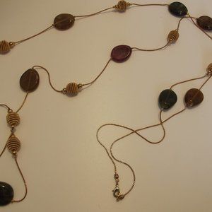 Extra LONG Gold Tone Chain Necklace Amber Cranberry & Green Tones with Gold