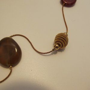 Red, green and amber colored resin beads made to look like stone, combined with wrapped gold tone beads. Can be used very long or wrapped twice or even 3 times for choker effect. Many ways to wear this. It is 60 inches long ! Has some patina.