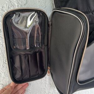 This will hold everything you need to travel! Gold colored zippers Black plastic material perfect for cleaning with inside material easy to wash too. So many zippers and pockets for large and small hygiene products. All zippered up measures 13” wide x 5.5” deep x 10.5” tall. Unknown brand. In perfect condition.