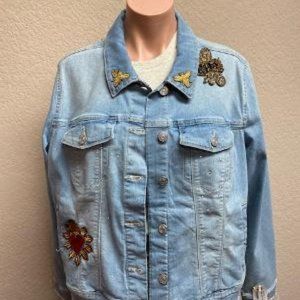 Very cute HAND MADE by Fat Rat Family Denim Jacket. On the back has a logo but on the front has a heart on the front pocket.