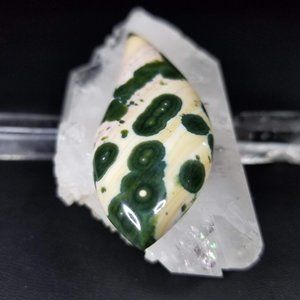 This is a beautiful, extra large Ocean Jasper cab, measuring 70.08 x 24.87 x 7.41mm. It has a cream and ivory background with a couple of swaths of lilac. The orbs are a deep, rich green. The front and sides of this cab are highly polished and the back has a satin finish. We have several more OJ cabs not yet listed, most of which are featured in videos on our Instagram page.