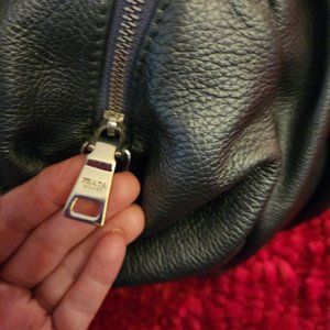 PRADA Extremely Soft and Supple dark pewter sheen..leather ..tanned and treated with natural products only...I have shown this bag stuffed full and without stuffing ..so you can get the idea of how much space is actually in this monster...it is very well cared for ..It does Not have cross body or shoulder strap..so I purchased a silver acrylic strap to match the silver hardware on bag..I will include this..the bad handles are very soft..as with alot of prada bags ..depending on the leather .they are made from..measurements are approx..as follows..a little over 17inches across top at widest..8 inches tall..bottom seam plate is 11×4.5..but fill out on sides to approx..17 inches..across...these were taken with handbag filled full..like in 1st pics..this is a beautiful bag..if you need a large bag.with the durability of very soft supple leather...you have found it.!! Last couple of picks show the softness of leather..Top view and laying on side.. EMPTY..it just "puddles"..or goes "flat"..as is pictures..this is Not a stiff structured bag..