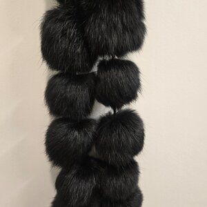 This rabbit fur pompom scarf measures 75 inches long and can be wrapped around your neck a couple of times for warmth. Or wear it long for an elegant look. It is pre owned and is in excellent condition. The black rabbit fur is authentic. I purchased it from Overland Sheepskin Factory. A great look on any coat or jacket.