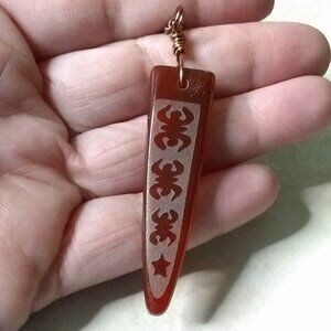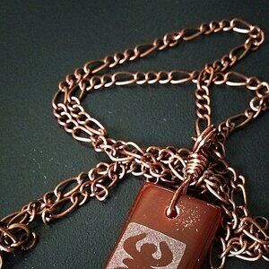 The stone is a dark russet Agate - and there are symbols etched into the front of the stone - please see close-ups for details. This is a long, slender pendant, just under 3" in length, including the wire wrapped bail. The copper Figaro Chain is app 20". Ask if you need a longer one!