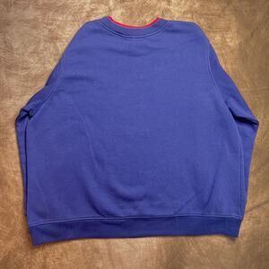 Blue sweatshirt with multicolor embroidery of a kitten, bird, trees and a bucket of apples. Layered red crew neckline. Vintage 1990s.