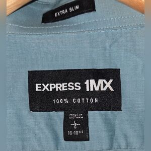 Sharp, modern, and flattering—this Express 1MX Extra Slim Fit dress shirt is perfect for upgrading your wardrobe. Lightweight, breathable 100% cotton in a fresh light green hue. Tag size L (16–16.5 neck), fits close to the body for a sleek silhouette.