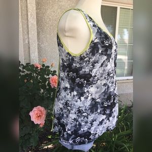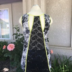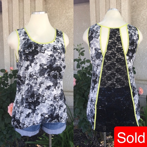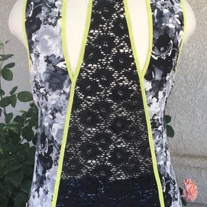 Floral rose pattern in front. See through crochet in back. Neon detail with a unique cut out in back. This is a breezy lil top for this hot weather