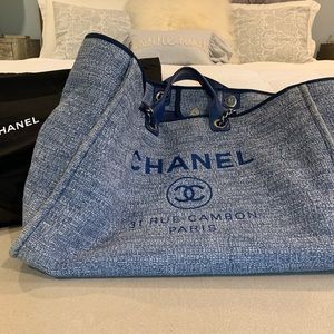 Extra large Chanel Deauville blue tweed tote with leather handles, sparkley stitching and extra large dust bag. Bag size(excluding handles) 14” tall x 20-26” wide. Very large and excellent for travel, beach, diaper bag, etc.