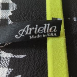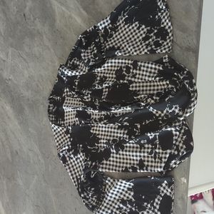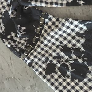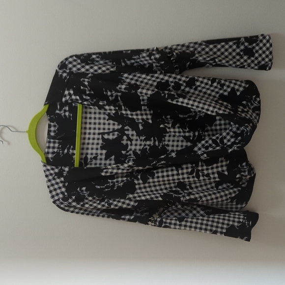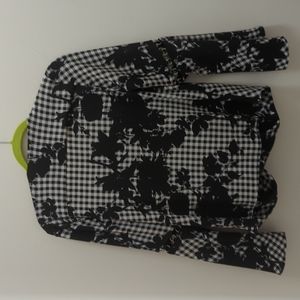 extra large pullover blouse by Ariella.Black and white checkered and floral pattern.Fluffed sleeves with decorative silver rings that connect each sleeve.