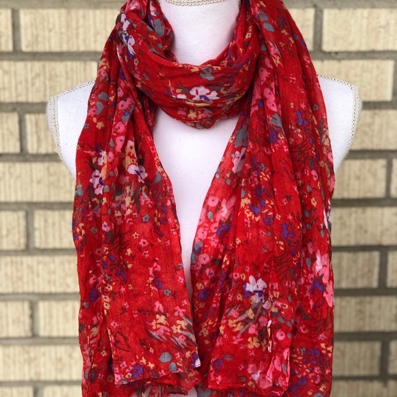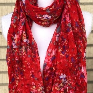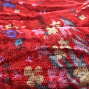 This is a beautiful red scarf with a blue, pink and yellow floral pattern. Measures 38 x 74” and would be great as a scarf, wrap or even for a boho look in your home.
