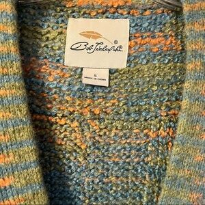 Soft knit zip front cardigan with pockets in Tones of green, blue and melon. Worn once! Beautiful in person!