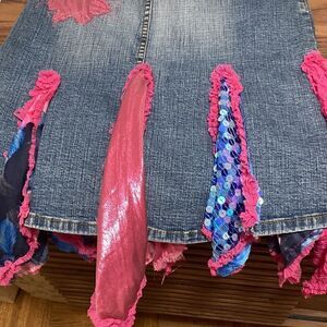 Dazz distressed denim skirt purchased at Detour boutique in Soho, New York. This skirt is one of a kind with extraordinary details. Rose appliqué with blue sequins on left hip front & back. 7 handkerchief inserts around hem,floral, pink,and blue sequins. Very Barbie core. Perfect if you need an outfit to wear to the movie
