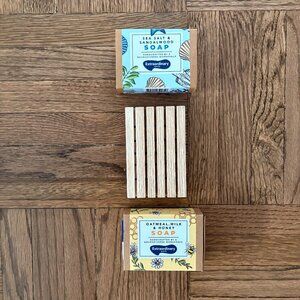 Suitable for all skin types. Each soap weights 3 oz and measures 3.5 × 2.5 × 1.5 in.