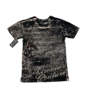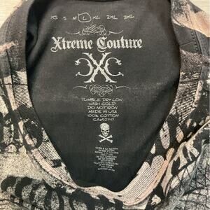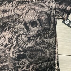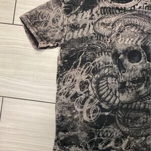 Extreme Couture allover print tee with skeleton and snake design. Bold and edgy style.
