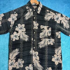 Extreme Gear Mens L Hawaiian Shirt Gray Tan Floral 100% Poly Made in Korea