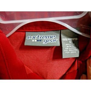 This Extreme Gear Men's Small button short sleeved shirt features a unique tribal design in a vibrant red geometric pattern. Crafted from durable polyester, it's the perfect blend of style and comfort.