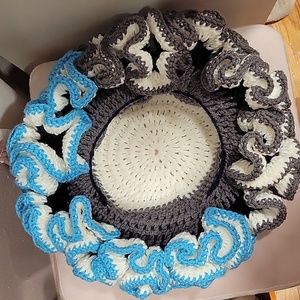 Handmade crochet EXTREME RUFFLE hat crafted with soft acrylic yarn. Colors gray, white, and light blue featuring a textured stitch pattern that adds a touch of uniqueness. The brim is neatly stitched, providing a stylish stitch that blends with the overall design. The hat's crown is comfortable, full, and fluffy making it a cozy and fashionable fit with protective styles. I added an inner crocheted line to make the hat a more comfortable and snug fit.